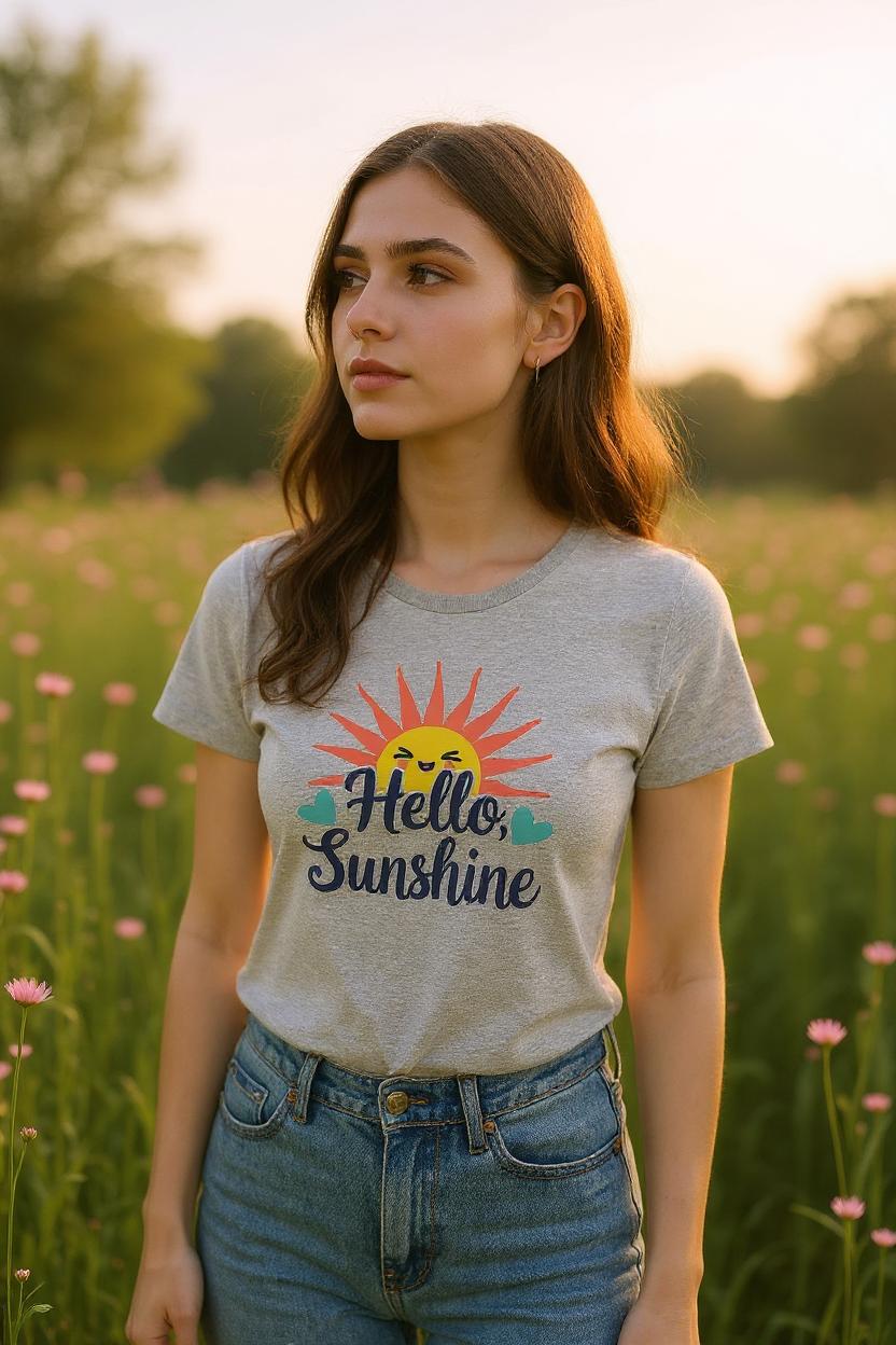 Empieza el día con una sonrisa y lleva el sol contigo. Nuestra camiseta «Hello, Sunshine» en azul claro es un soplo de energía positiva. Su diseño vintage está pensado para levantar el ánimo (y el look).